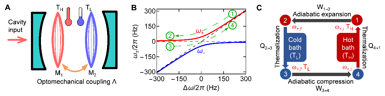 (A)两片通过光力耦合的微纳薄膜构成的实验装置;(B)强耦合体系的两支本征模式呈现抗交叉效应(anti-crossing); (C)本征模式构建的四冲程Otto热机循环