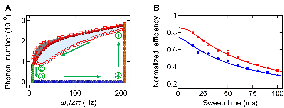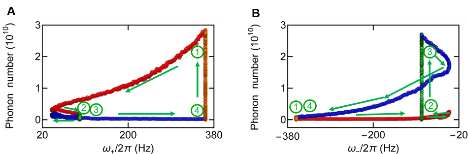通过对两个微纳振子运动模式的实时测量,得到本征模式的实时声子数,分析了单缸Otto热机的热力学循环和做功效率。图中红点表示本征模在热力学循环中的做功冲程(实验上该冲程的扫描时间可控)。