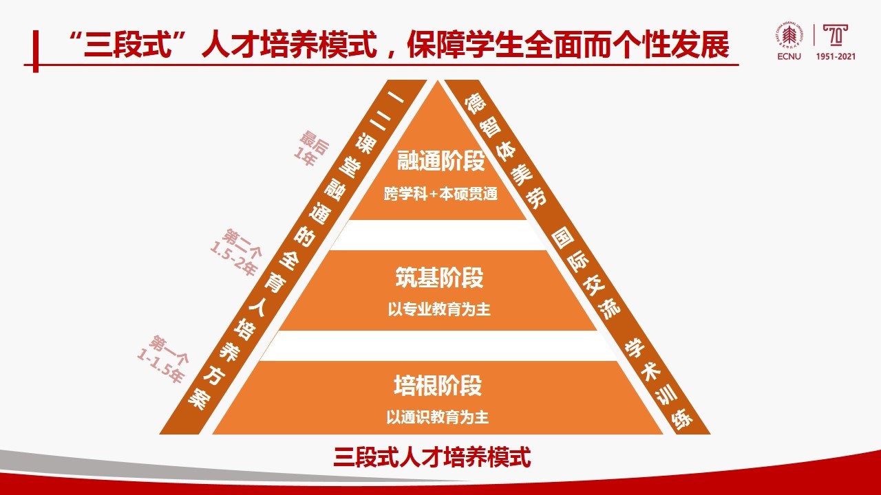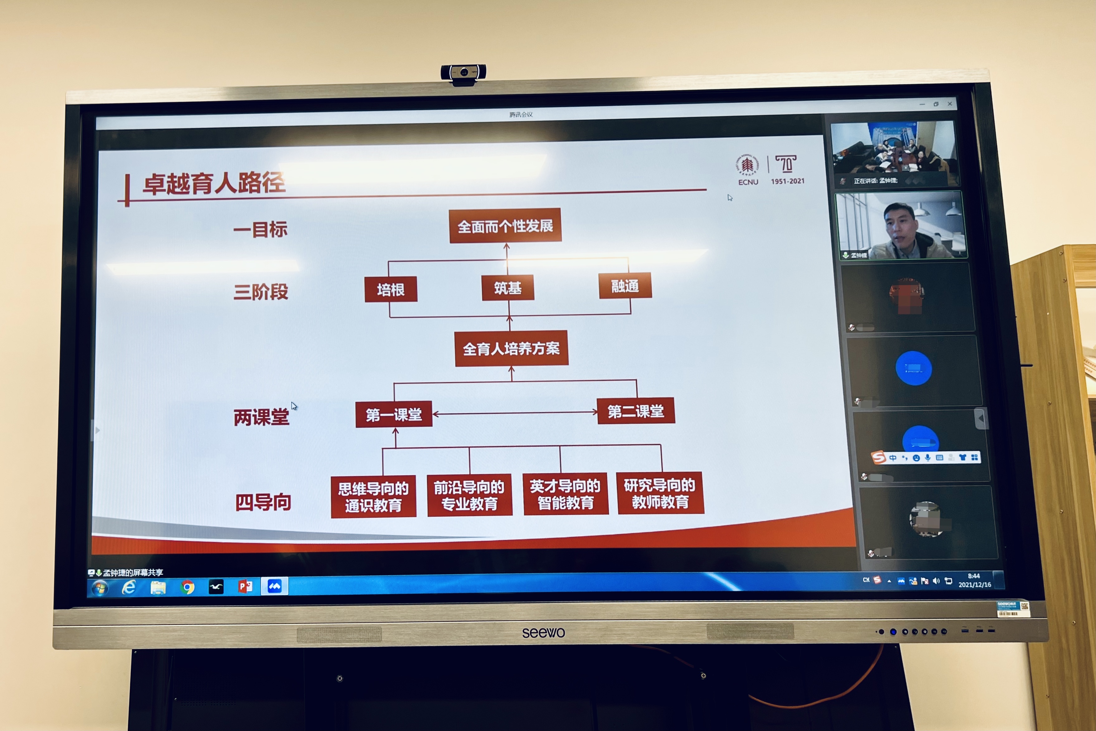 接着,孟钟捷从“一三两四”即学生的全面而个性发展为目标、培根-筑基-融通“三段式”人才培养模式、第一课堂第二课堂融通、“四导向”为引领的卓越课程体系等卓越育人架构体系为出发点,重点从五个方面重点解读了华东师大卓越育人路径:一是“三段式”人才培养模式,保障学生全面而个性发展。培根阶段,以思维为导向,提供高质量通识教育;筑基阶段,推行前沿导向的专业教育,融入最新知识与前沿进展;融通阶段精选多元培养路径,满足学生个性化需求。二是第一课堂和第二课堂融通,形成全育人理念培养方案。建立书院副书记和院系教学院长“双参与”机制,联动第一、第二课堂,将养成教育纳入培养方案,深度融合“教”与“育”。三是“四导向”为引领的卓越课程体系,促进学生卓越成长成才。以“思维导向的通识教育、前沿导向的专业教育、研究导向的教师教育、英才导向的智能教育”为引领,全面升级课程体系,提高课程高阶性、创新性和挑战度。四是以一流专业建设为基础,探索多元化人才培养改革模式。以量大质优的一流专业为抓手,系列人才培养举措迭代推新。如:强基计划、基础学科拔尖学生培养计划2.0基地、卓越教师培养、双学士学位复合型人才培养项目、新工科、新文科等。五是构建“多元联动”育人体系,有效满足学生的卓越发展。灵活的修读制度、书院养成教育、实习课程与实践机会、创新创业、海外交流、“五育并举”的养成教育体系等,为学生的全面而个性发展提供了充足的养分。