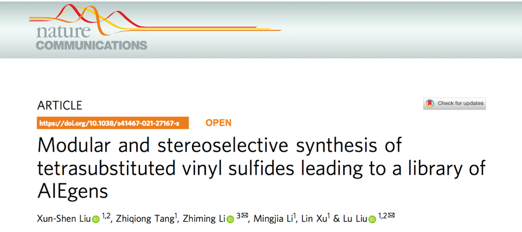 相关成果以“Modular and stereoselective synthesis of tetrasubstituted vinyl sulfide leading to a library of AIEgens”为题于2021年12月15日在线发表于Nature 子刊 Nature Communications 上 (Nat. Commun. 2021, 12, 7298)。万象城awcsport官网2018级博士生刘迅绅为论文第一作者,硕士研究生唐智琼和本科生李名家参与了课题的研究,徐林教授在光学性质测试给予了帮助,复旦大学李志铭教授完成了DFT计算方面的工作。李志铭教授和刘路教授为论文共同通讯作者,万象城awcsport官网为第一完成单位。该项工作得到了国家自然科学基金委和上海市科委项目的资助。