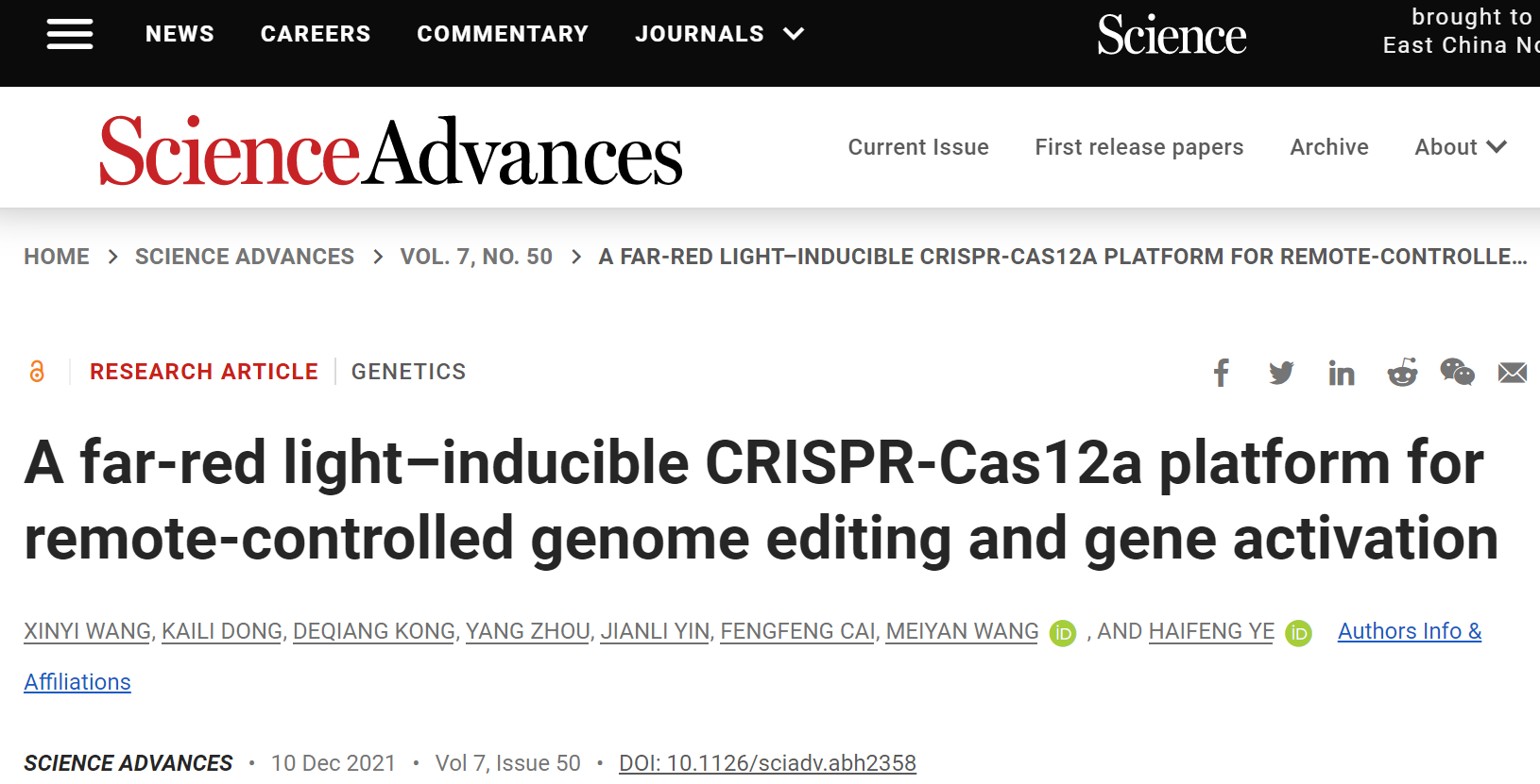 2021年12月10日,万象城awcsport官网生命科学学院、上海市调控生物学重点实验室、万象城awcsport官网医学合成生物学研究中心叶海峰课题组在国际著名学术期刊《科学—进展》(Science Advances)在线发表了题为 A far-red light–inducible CRISPR-Cas12a platformfor remote-controlled genome editingand gene activation 的研究论文,报道了一种远红光调控的基因编辑和表观遗传重塑的控制系统,为精准可控的基因编辑技术再添一员大将。这是继2020年7月开发的光控基因编辑工具FAST系统之后(Yuetal, Science Advances, 2020),开发的另一种全新版本。