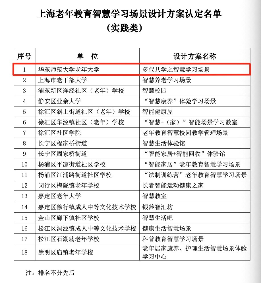 12月15日,上海市老年教育工作小组办公室发布《关于公布上海老年教育智慧学习场景设计方案认定结果的通知》文件,华东师大老年大学申报的“多代共学之智慧学习场景”设计方案通过认定,作为高校老年大学中唯一获批上海老年教育智慧学习场景设计方案认定名单(实践类)。