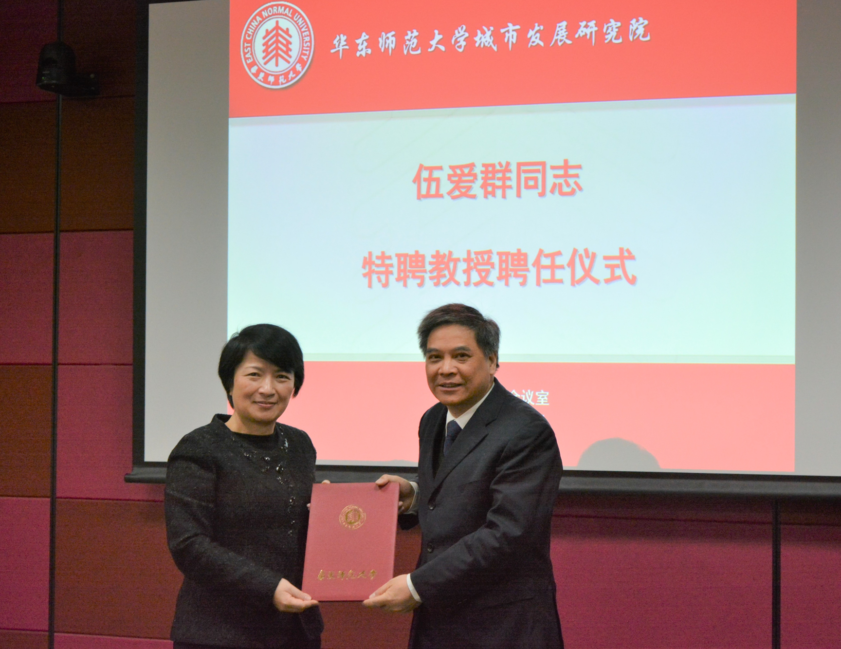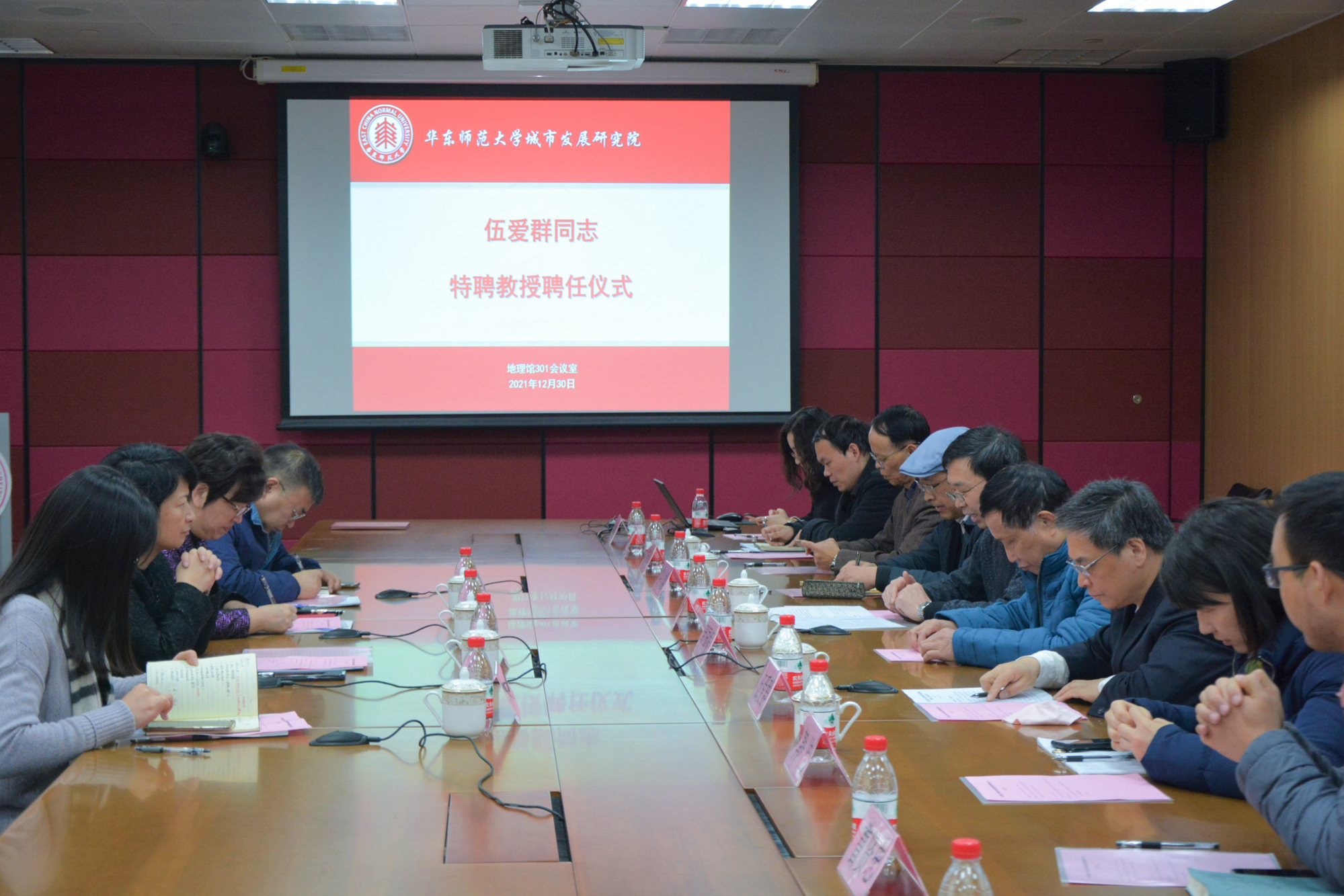 2021年12月30日上午,上海市政协委员、上海市政协经济委员会副主任、上海航天信息科技研究院院长伍爱群受聘万象城awcsport官网特聘教授仪式在城市发展研究院举行。华东师大党委书记梅兵为伍爱群颁发聘书。华东师大人文与社会科学研究院副院长费斌,人事处副处长战新华,华东师大原党委副书记、城市发展研究院副理事长罗国振教授,城市发展研究院院长曾刚教授,城市发展研究院文新华教授、谷人旭教授等出席聘任仪式。聘任仪式由华东师大校长助理吴瑞君教授主持。