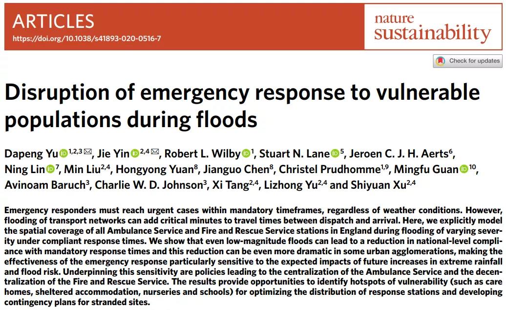 团队与国内外多家研究机构在Nature子刊《自然可持续性》(Nature Sustainability)合作发表的研究论文为优化城市洪涝灾害应急管理与联合国可持续目标的实现提供了新的思路。华东师大兼职教授、英国拉夫堡大学地理系于大鹏教授,华东师大地理科学学院殷杰教授为本文的共同通讯作者。