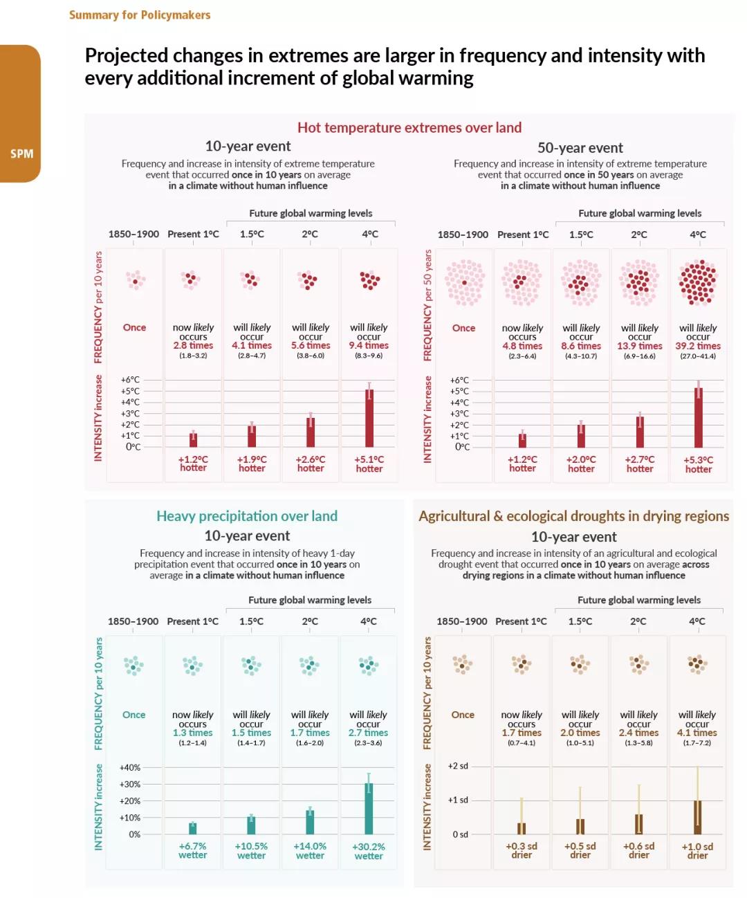 IPCC第6次评估报告关于未来极端事件频率和强度变化的预估。图片来源于IPCC第6次评估报告《决策者摘要》,其中关于极端温度和极端降水的内容源于李超研究员的成果。