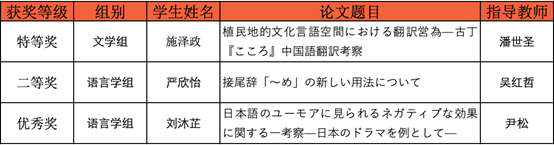 此次大赛,我校外语学院日语系共有四名学生(2018级)提交论文,施泽政、严欣怡两人顺利闯关进入决赛,最终经过决赛的激烈角逐,施泽政(潘世圣指导)以《植民地的文化言語空間における翻訳営為ーー古丁『こころ』中国語翻訳考察》获文学组特等奖;严欣怡(吴红哲指导)以《接尾辞「~め」の新しい用法について》获语言学组二等奖;刘沐芷(尹松指导)获语言学组优秀奖。潘世圣、吴红哲、尹松获优秀指导教师奖。