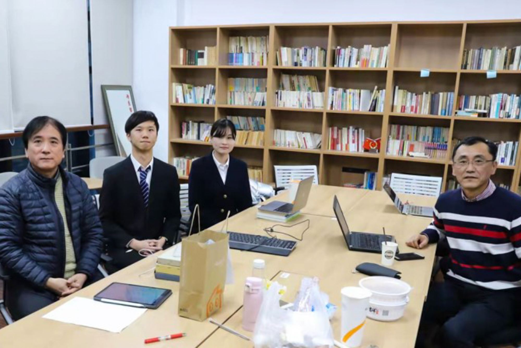 决赛参赛选手施泽政、严欣怡和指导教师潘世圣(左一)、吴红哲(右一)