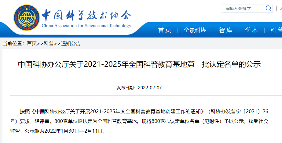 中国科协办公厅关于2021-2025年全国科普教育基地第一批认定名单的公示
