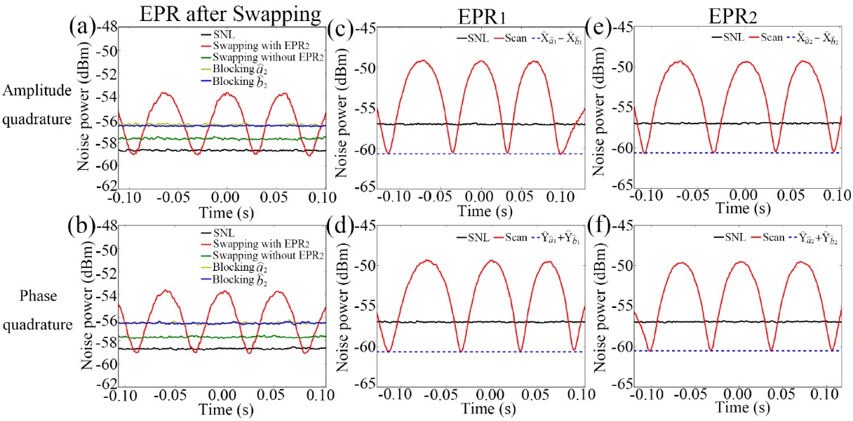 在实验中,首先通过搭建两套四波混频过程来产生两组相互独立的高纠缠度双光束量子纠缠源(EPR1和EPR2)。Alice和Bob分别拥有两组独立双光束量子纠缠中的一束。之后,将两组独立双光束纠缠中剩下的两束光通过4F成像系统传给第三方Claire。Claire通过一个基于四波混频过程的高增益低噪声光学参量放大器对两束光的量子信息进行全光学提取,并利用一个全光通道把提取到的量子信息传输给Bob。最后,Bob利用线性光学分束器将接收到的量子信息传递到其所拥有的光束上,从而完成全光量子纠缠交换。全光量子纠缠交换协议完成之后,两个最初独立的光场在没有直接相互作用的情况下就具有了量子纠缠特性。如下图所示,Alice和Bob拥有的两个最初独立的光场在全光量子纠缠交换协议完成之后,其正交振幅分量的量子关联为0.43±0.06 dB,而正交相位分量的量子关联为0.42±0.05 dB,展示出了显著的量子纠缠特性。