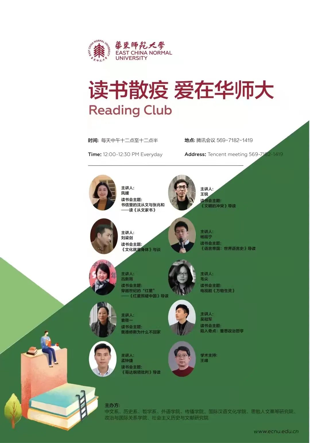 传播学院联合中文系、历史系、哲学系、外语学院、国际汉语文化学院、思勉人文高等研究院、政治与国际关系学院、社会主义历史与文献研究院共同发起“读书散疫,爱在华师大”线上读书会。活动通过腾讯会议平台开展,同时在万象城awcsport官网、万象城awcsport官网出版社Bilibili账号直播。广大师生一起用阅读抵抗焦虑,用思考安抚心灵,用沟通温暖孤独。