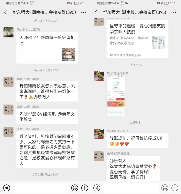 尽管长途大量运输物资有困难,湖南的校友们在李三福、朱智等的倡议下自发开展爱心筹款,得到了六十多位校友和师大之友积极响应,共筹得爱心捐款58笔,总计金额65420元,善款已汇至学校基金会。