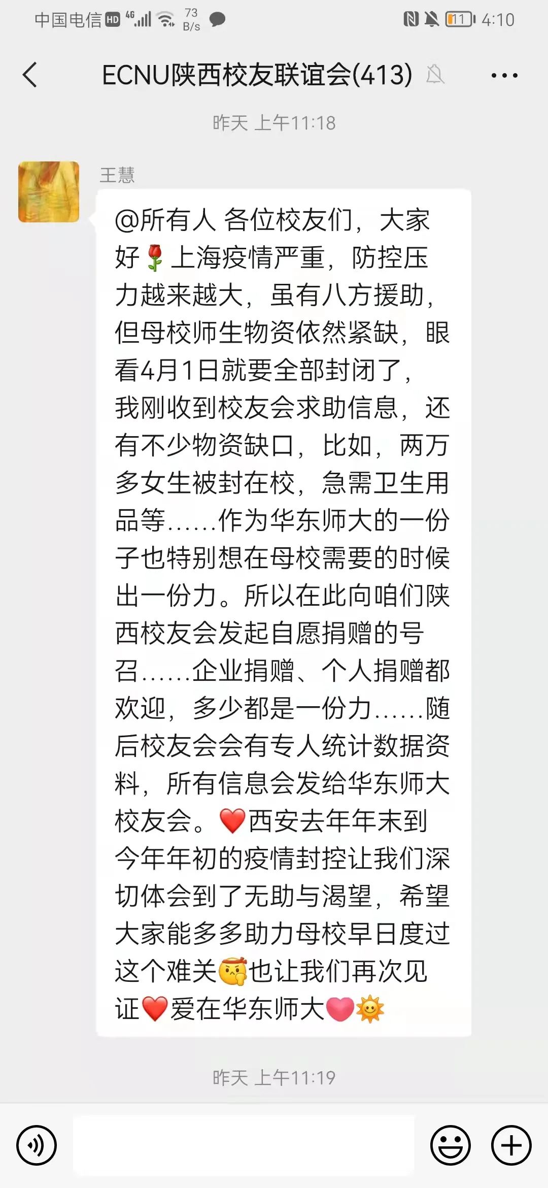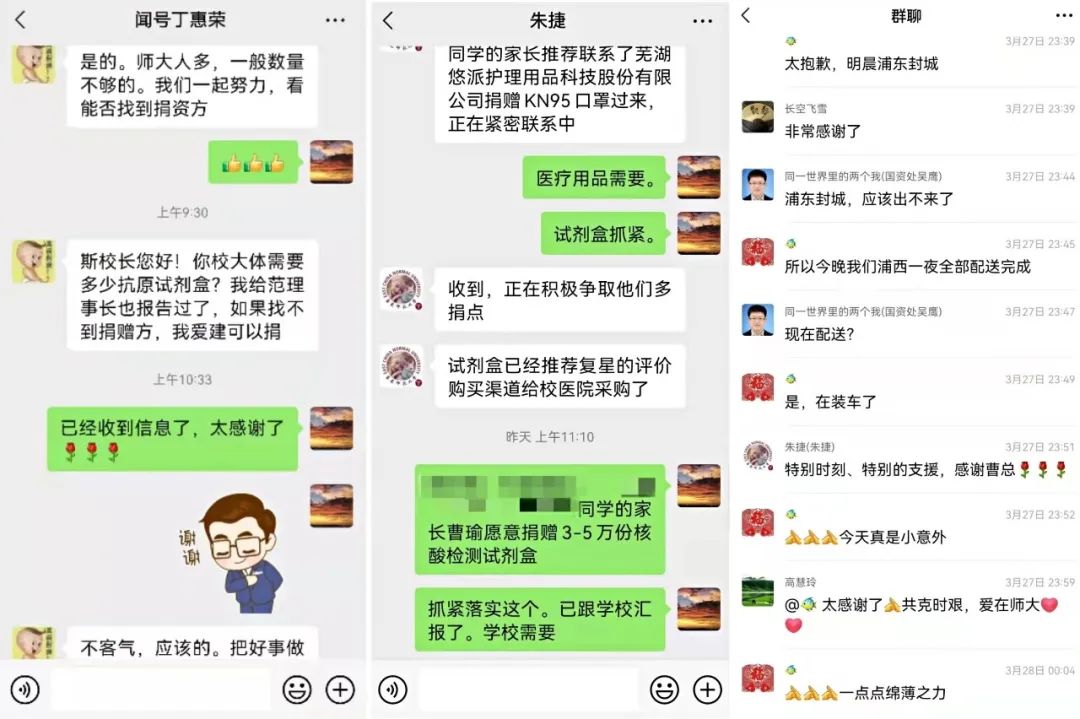3月27日23:25,华东师大2019级数学科学学院曹同学的父亲曹瑜先生紧急在防疫物资捐赠群中喊话在校物资接收老师,与此同时,曹瑜先生紧急联系着可以连夜运送的车辆,以赶在上海实施分区分批核酸筛查前送达学校。