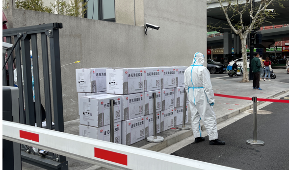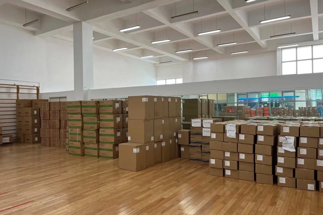 大米2000斤,肉类7386.8斤+1000条带鱼+1000盒虾仁,蔬菜55572斤,水果2032箱+22500斤+20000个,鸡蛋120箱(约26400个),方便面、自热米饭、饼干等方面食品约4088箱+231285件,牛奶和饮料45390瓶+851箱,水84096瓶+2925箱,其他生活用品202箱+11375件,防护服13900件,口罩366600只+600盒,手套175000只,抗原试剂盒20600支,核酸检测材料5000套,防护面屏25000个,泡腾片2000盒,洗手液10380瓶,鞋套4000双。这些心意,都收到了!