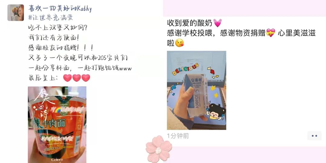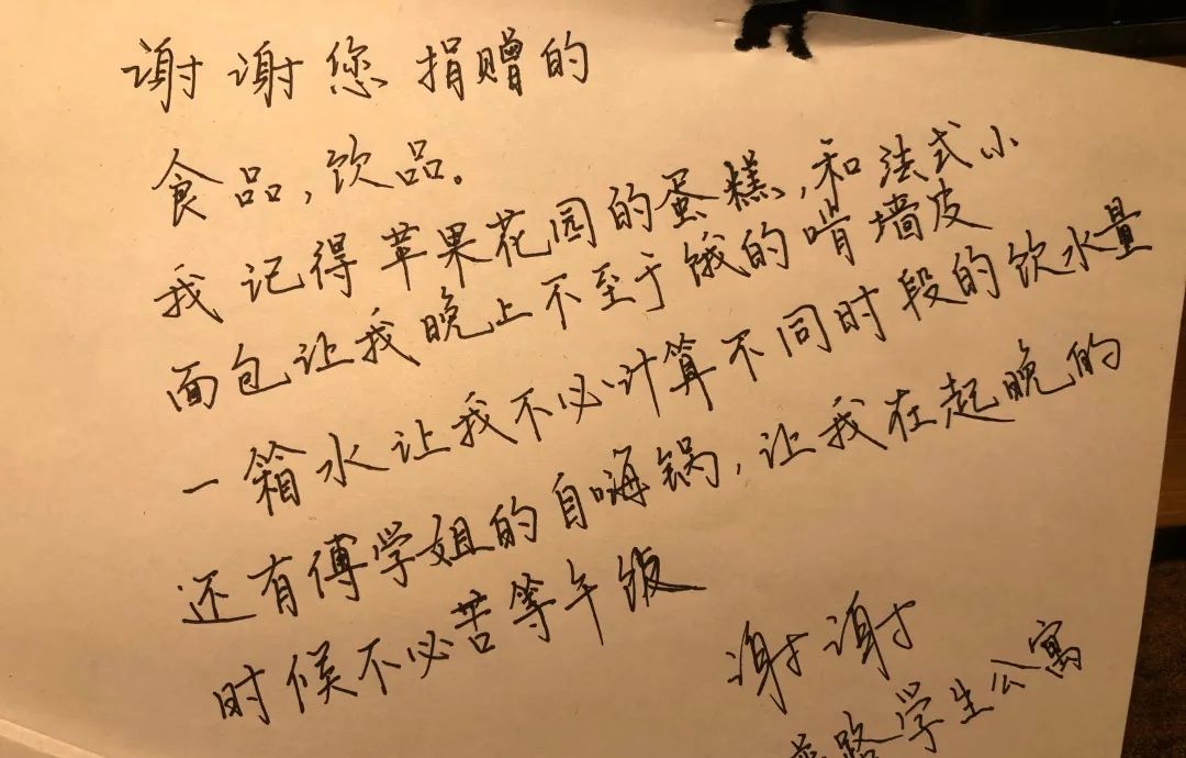 师生校友无论是在校内还是校外,都以自己的方式传递着温暖的力量。听闻同普路学生宿舍的同学面临物资紧张的情况,2003级旅游管理专业校友傅文珺立刻赶到超市自己花钱采购了36箱共计416份自嗨锅送到同学手中。当收到同学们手写的感谢信,傅文珺平静地说:“回馈母校是应该的。”