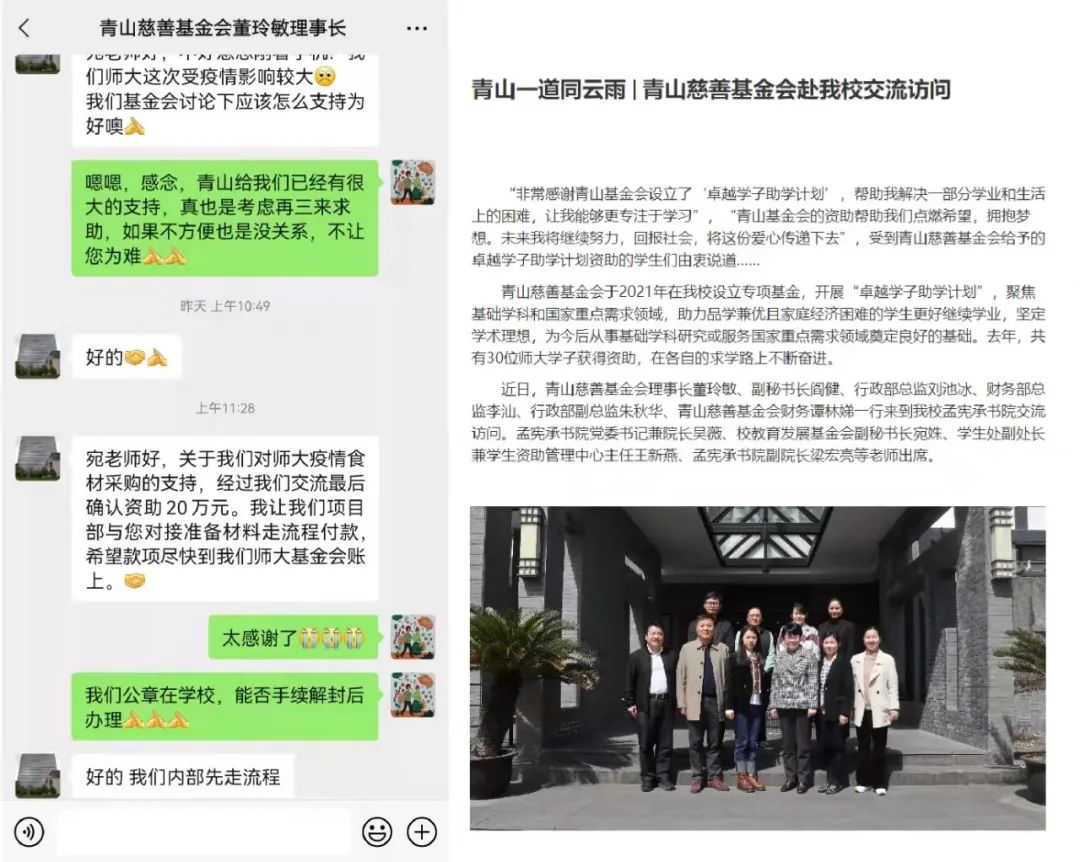 20万善款特事特批、迅速到账的背后,更是青山基金会与学校的深厚情谊。2021年,青山基金会就已在我校设立专项基金,开展“卓越学子助学计划”,助力品学兼优的学生更好继续学业,共有30位师大学子获得资助,在各自的求学路上不断奋进。在学校疫情防控的关键时期,青山基金会密切关注学校需求,再度鼎力相助,与师大携手前行,风雨与共。