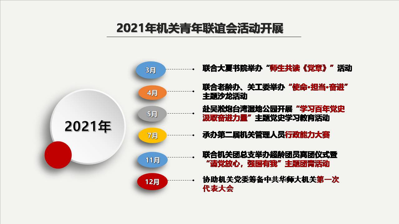 机关青年联谊会紧紧围绕学校“迎双庆”中心工作,服务学校发展大局,积极克服疫情对于活动组织的不利影响,成功举办多次机关青年喜闻乐见的主题活动。通过遴选机关优秀青年参与大夏书院的“师生共读《党章》”活动,进一步引导机关青年紧密围绕学校“卓越育人”这一中心工作;通过联合老龄办、关工委举办“使命·担当·奋进”主题沙龙活动,学校原党委副书记罗国振作题为“如何成为一个合格的高校管理人员”主题报告,以老同志传经送宝、青年同志经验分享的方式,进一步促进机关青年积极为学校改革发展贡献聪明才智;通过赴吴淞炮台湾湿地公园开展“学习百年党史汲取奋进力量”主题党史学习教育,进一步加强了机关青年了解党的百年光辉历史,感悟党的初心使命;通过承办第二届机关管理人员行政能力大赛、联合机关团总支举办超龄团员离团仪式暨“请党放心,强国有我”主题团青活动及协助机关党委筹备中共万象城awcsport官网机关第一次代表大会,进一步彰显机关青年党员骨干的先锋模范作用。