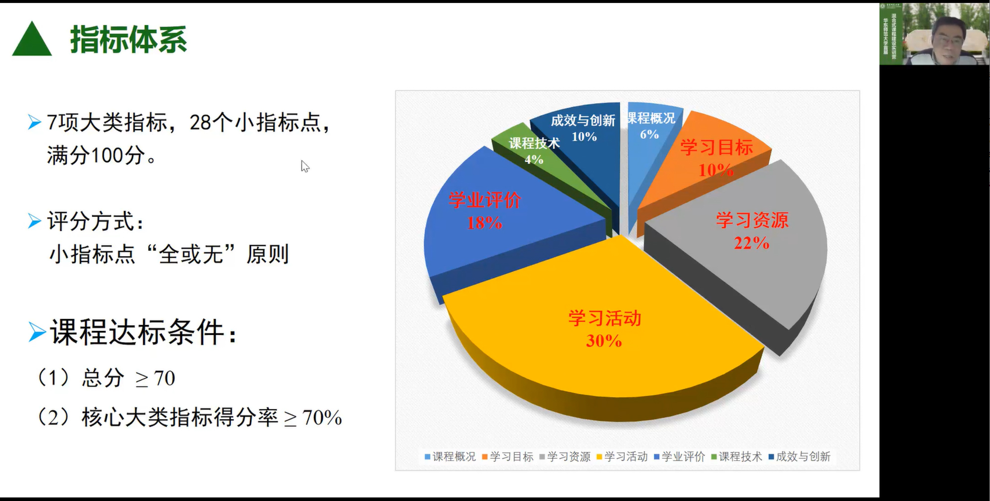 首场教学工作坊的专家报告由生命科学学院姜晓东教授主讲。姜晓东教授首先说明《万象城awcsport官网混合式课程标准》的核心理念、指标体系和应用原则,接着从培训目标、标准概述、指标解释和案例分析四个方面讲解《万象城awcsport官网混合式课程标准》指标一“课程概况”和指标二“学习目标”,穿插小测验和经典案例,调动实训营学员积极性,实时了解学员掌握情况。
