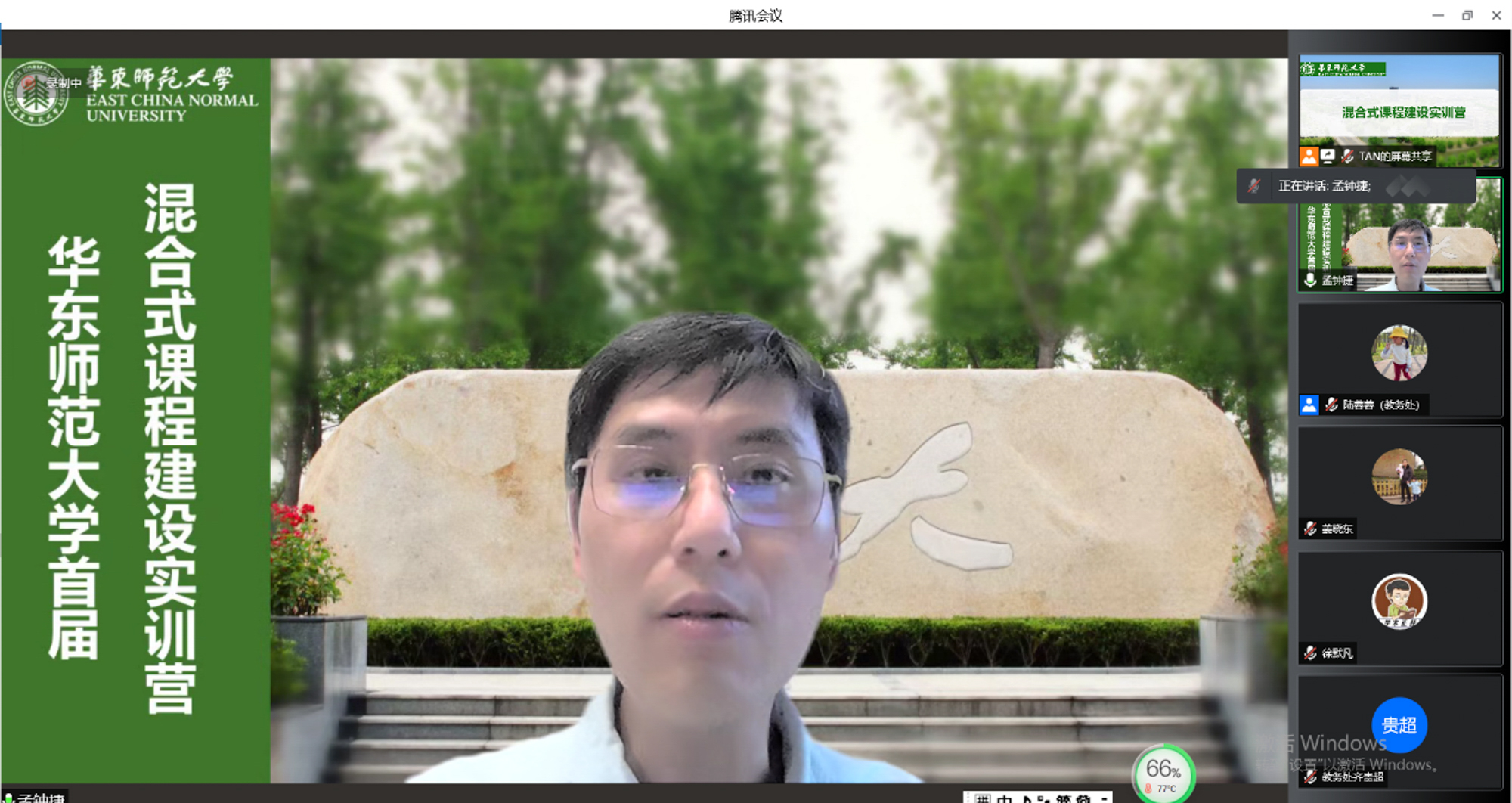教务处处长孟钟捷教授在开营仪式上致辞。他表示,教学改革改到“实处”是课程,改到“痛处”是教师,教师是决定课程质量的关键,学校将加强教师育人能力作为教师队伍建设的重要抓手。教师教学发展中心推出的“混合式课程实训营”采用工作坊的形式,凸显精细化和个性化,秉持在“实践中探索、在困惑中学习、在研讨中反思、在领悟中创新”的原则,结合教师自我反思、同伴互助与专家引领等多种途径和方式,取长补短,真正把“探究、合作、分享、励志”的华东师大教研文化落实到细处,期待大夏学堂示范课程负责人能把课程真正建设为“金课”。