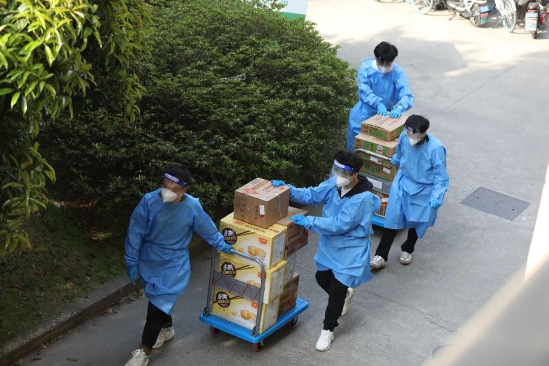 从4月1日开始,由于疫情形势有了变化,一号楼与八号楼的志愿者们被分为了两个小组,在黄天翔老师的带领下每天轮岗负责整个北片区近2700人三餐的派送。