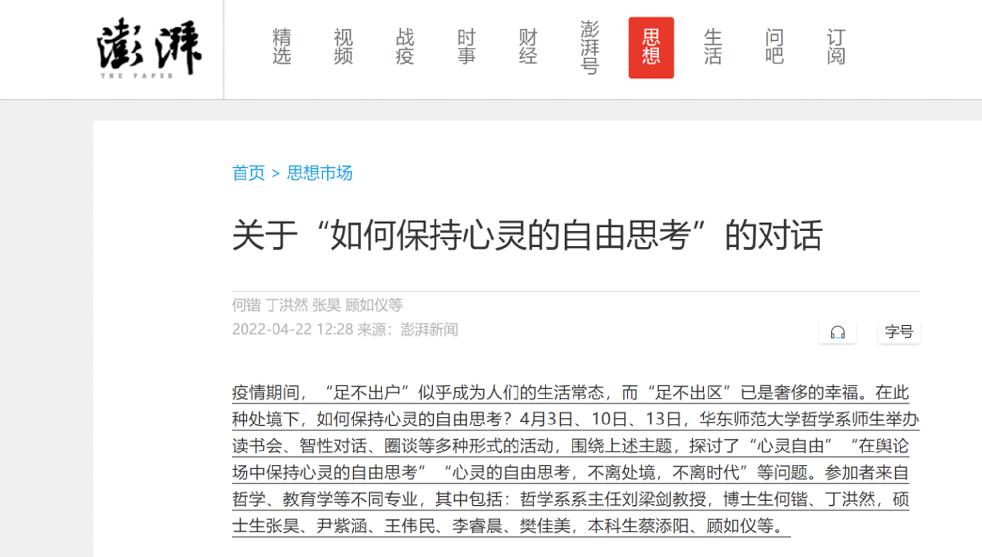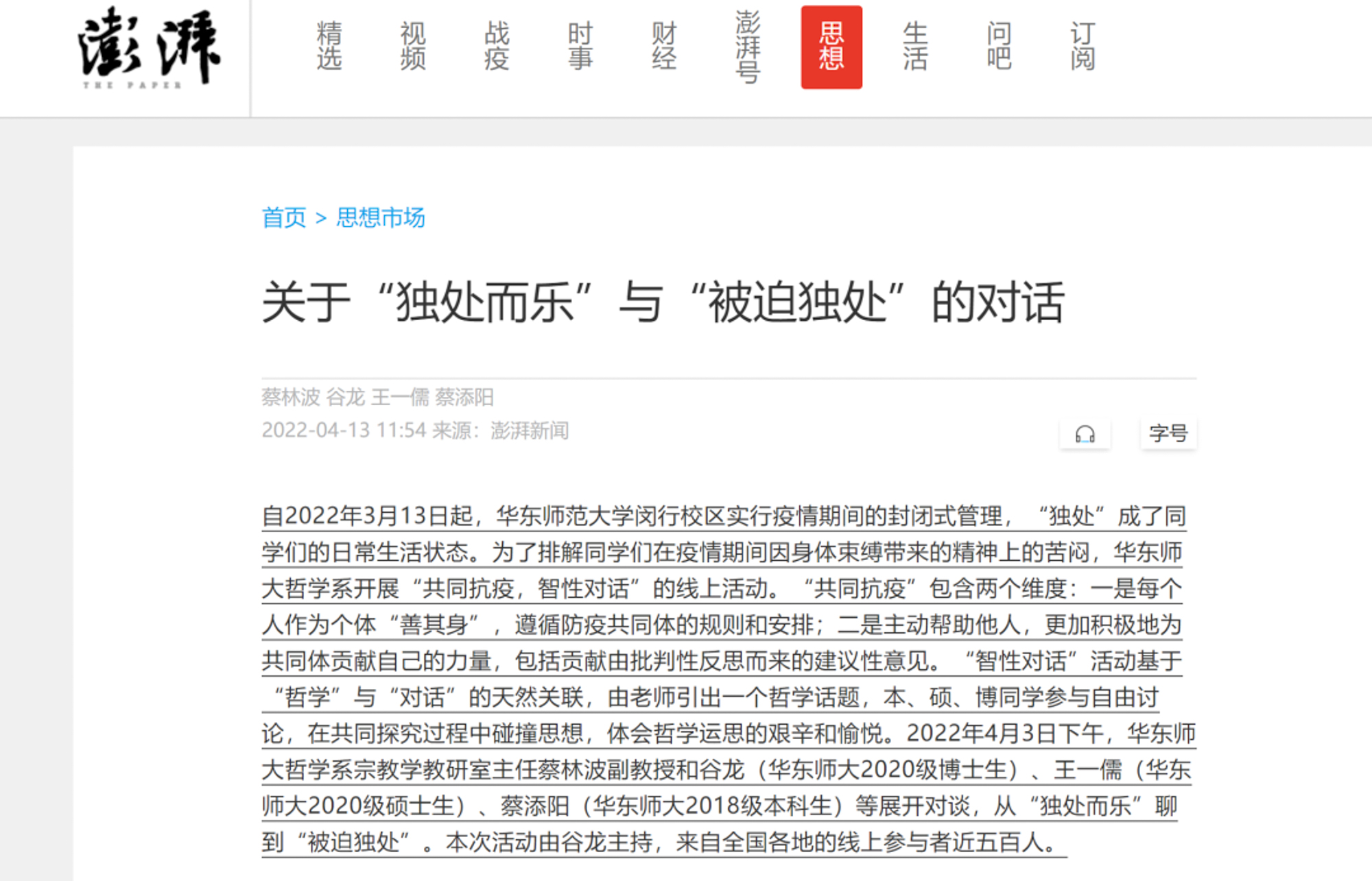 “智性对话”活动基于“哲学”与“对话”的天然关联,由老师引出一个哲学话题,本硕博同学参与自由讨论,在共同探究过程中碰撞思想,体会哲学运思的艰辛和愉悦。四月份活动主题包括“何以‘独处而乐’”“何以‘不论处境如何,始终保持心灵自由思考’?”“漫谈‘焦虑的认识’与‘认识的焦虑’”“曲木之材,何以求直——康德之问”等。《澎湃新闻》“思想市场”先后刊发了两篇对谈整理稿(4月13日、22日)。
