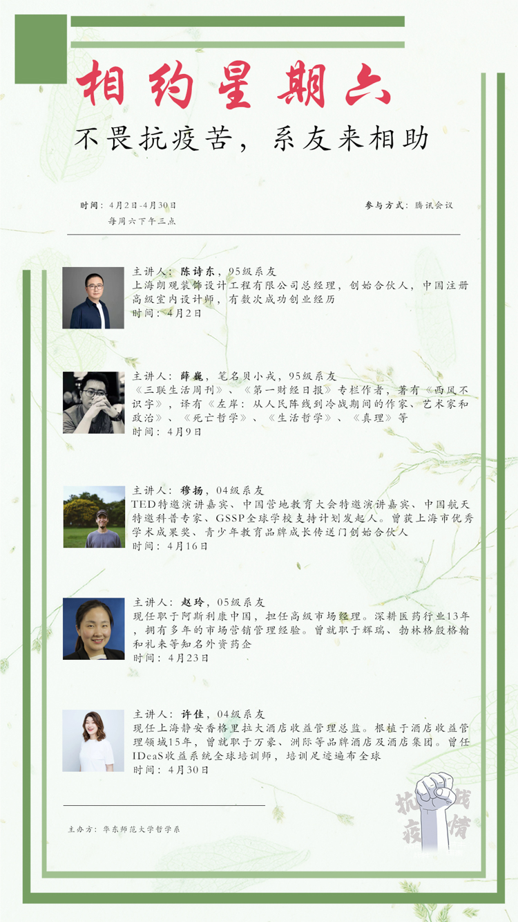保“安”离不开校外的支援和帮助,而内外贯通无疑将有力推动向“好”。仍以哲学系为例。华师大进入封闭式管理不久,2005级系友赵玲女士便积极倡议,联络陈诗东、薛巍、穆扬、许佳、王弘毅、宋菲、江求流、孟凯、陈新华等多位系友策划了“不畏抗疫苦,系友来相助”的系列活动。