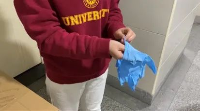 用酒精喷雾对使用后的手套进行消杀,摘下手套(边摘边把手套翻面,手尽量不要碰到已经污染的正面)并丢在垃圾桶中。