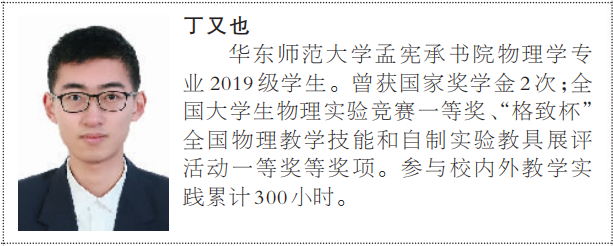 奋斗不只是响亮的口号,而是要在做好每一件小事、完成每一项任务、履行每一项职责中见精神。“田家炳杯”第七届全国师范院校师范生教学技能竞赛一等奖、第七届全国大学生物理实验竞赛(创新)一等奖、第十二届“格致杯”全国物理教学技能和自制实验教具展评活动一等奖、上海市师范生教学技能竞赛一等奖、第三届上海市师范生教学基本功大赛一等奖……近30项各类荣誉和奖项,丁又也离自己的梦想更近了。