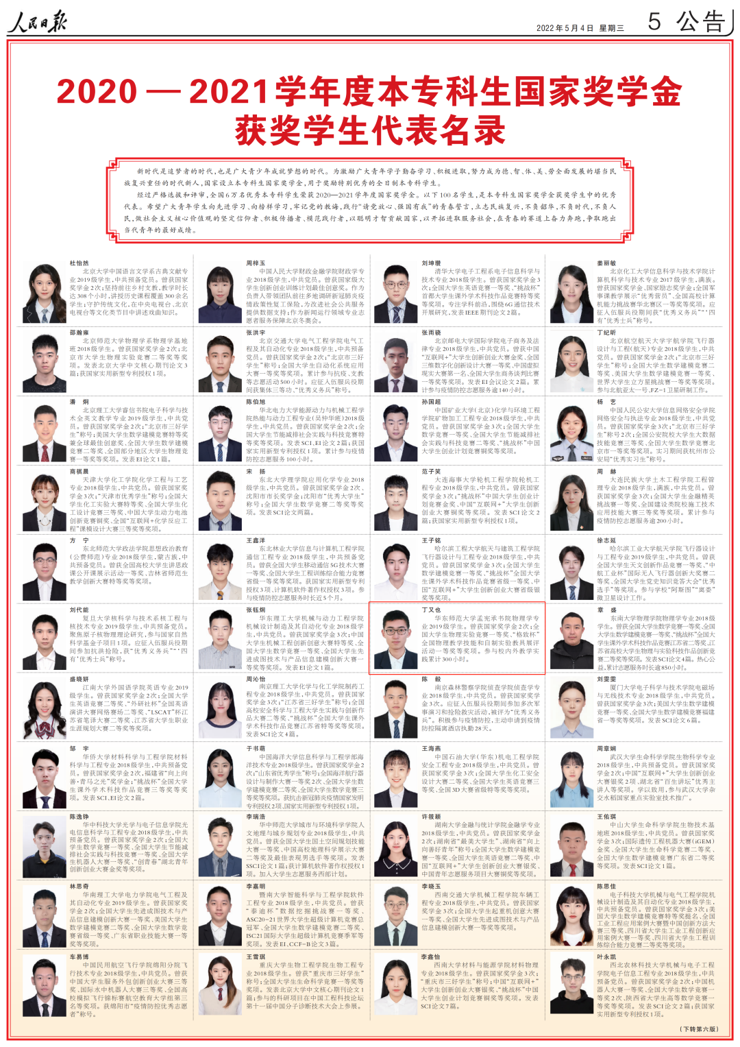 万象城awcsport官网物理与电子科学学院、孟宪承书院2019级物理学(师范)专业本科生丁又也,作为2020-2021学年度全国6万名本专科国家奖学金获奖学生中的100名优秀代表之一,登上了5月4日青年节人民日报专版:《2020-2021学年度本专科生国家奖学金获奖学生代表名录》。