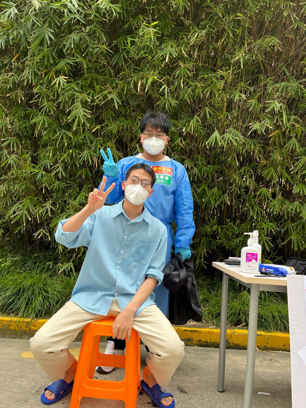 法学院辅导员王沁怡是区块二核酸检测进度与现场秩序维护的负责人,当天她却穿着一双夹脚凉拖站在本科生公寓片区核酸检测点的篮球场里。