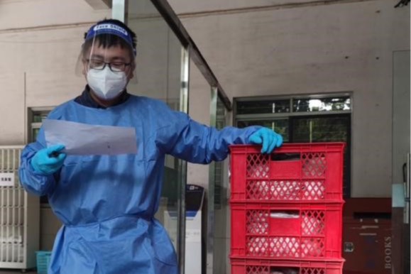 在王璐妍、韩亚鲁同学带领的党员志愿者团队负责维护核酸检测秩序这项志愿工作后,我便和孙帜、纪晨毓、陈悦三位同学一起负责起研究生公寓物资转运工作,协助工作组老师招募志愿者负责转递药品以及配送同学们在教育超市订购的生活物资。