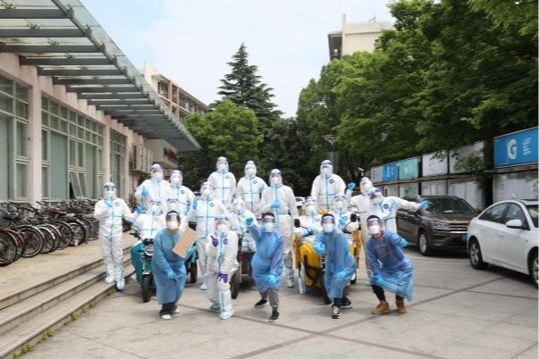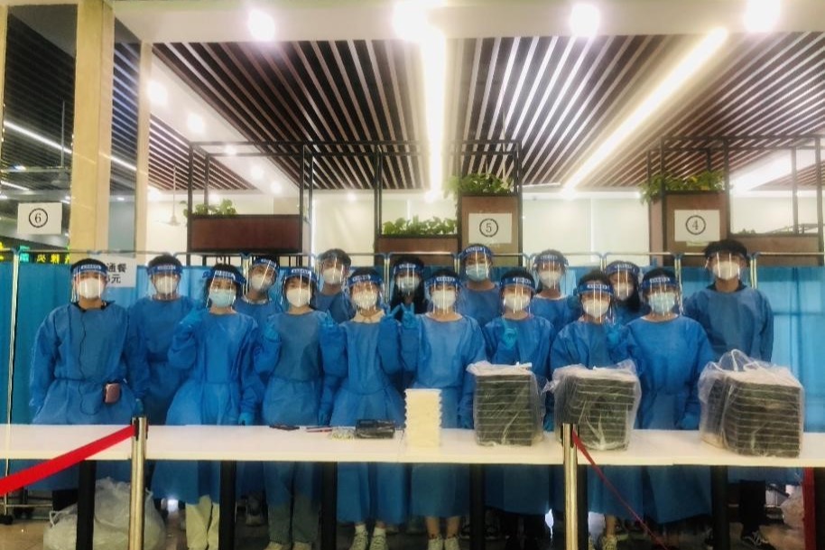 为楼内服务志愿者分发防疫物资(左起:吴潇宇、陈悦、纪晨毓、张铭荃)
