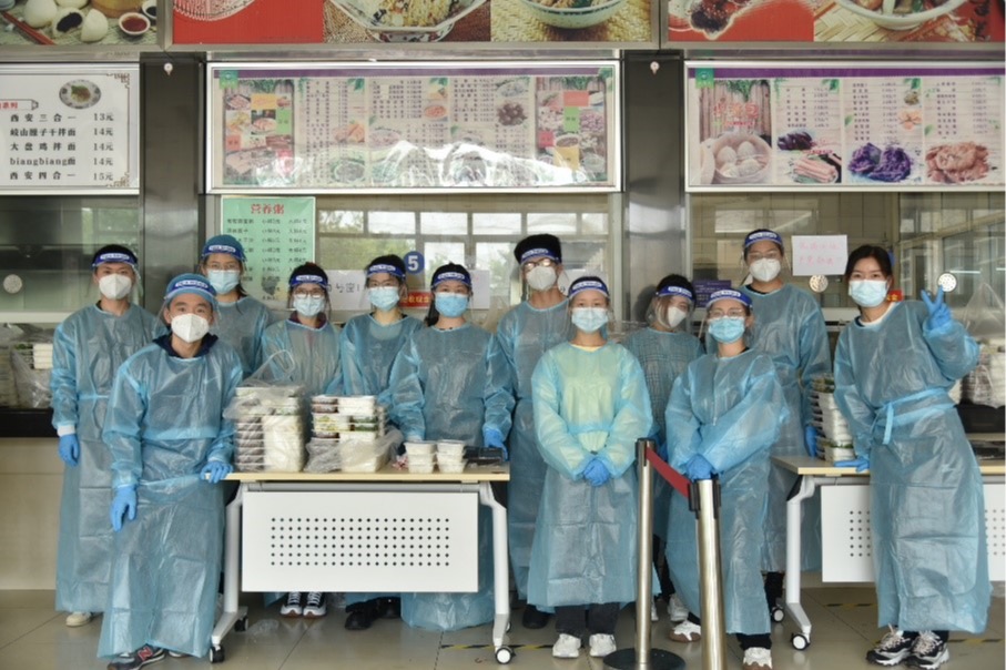 此时等待着我们的是一个全新的任务:在食堂协助售餐和维持秩序。因一天三餐都需要志愿者协助,任务量突然加大,胡增艳和查莎两位小伙伴便一起加入我们的“卖饭小分队”。我们五人便开始轮班协助老师负责研究生公寓北区的售餐工作。