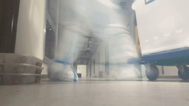 但在防护服的约束下,在防护面罩的模糊下,认人基本靠猜,交流完全靠吼,为了让同学们能够准点吃到热腾腾的饭菜,大家边捧着一大筐盒饭利用安全楼梯在不同楼层间传递,边诅咒着那不听话的电梯是如此不争气。