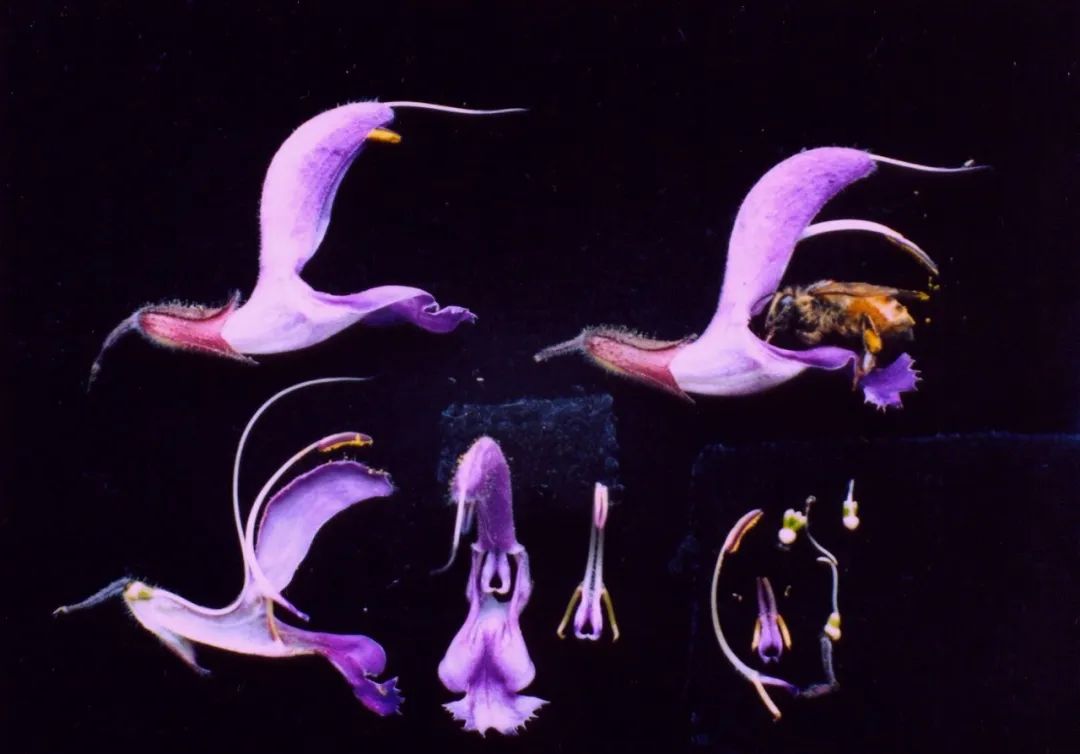 左上:一朵花的侧面观;右上:蜜蜂来采蜜,它往里钻的时候雄蕊打下来,把花粉给了它;下:解剖结构示花冠筒口部药隔形成的活门。