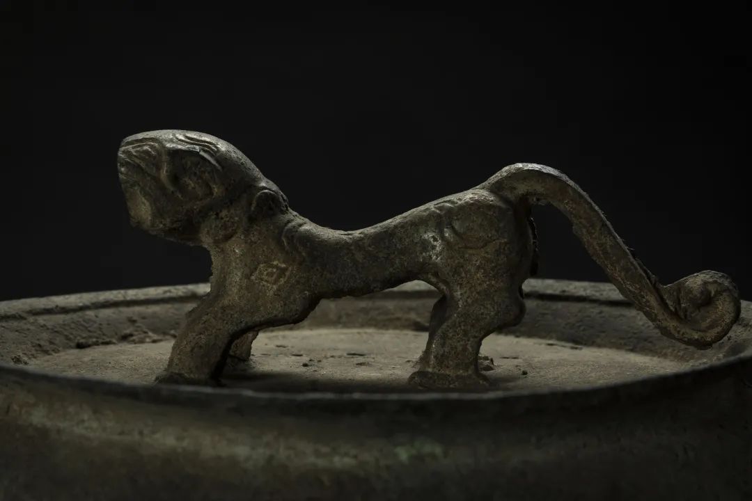 錞,又作錞于,铜制军中击打乐器,常与鼓相配,用于战阵。目前发现最早的作于春秋时期,盛于汉代。形如圆筒,上大下小,中空,顶上多作虎形钮,可悬挂。——《万象城awcsport官网博物馆精品图集(一)》