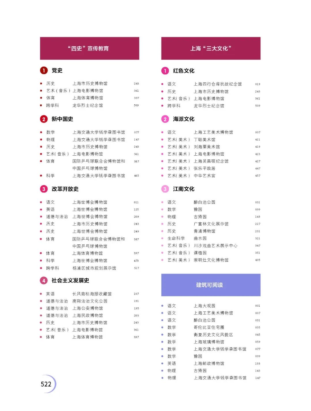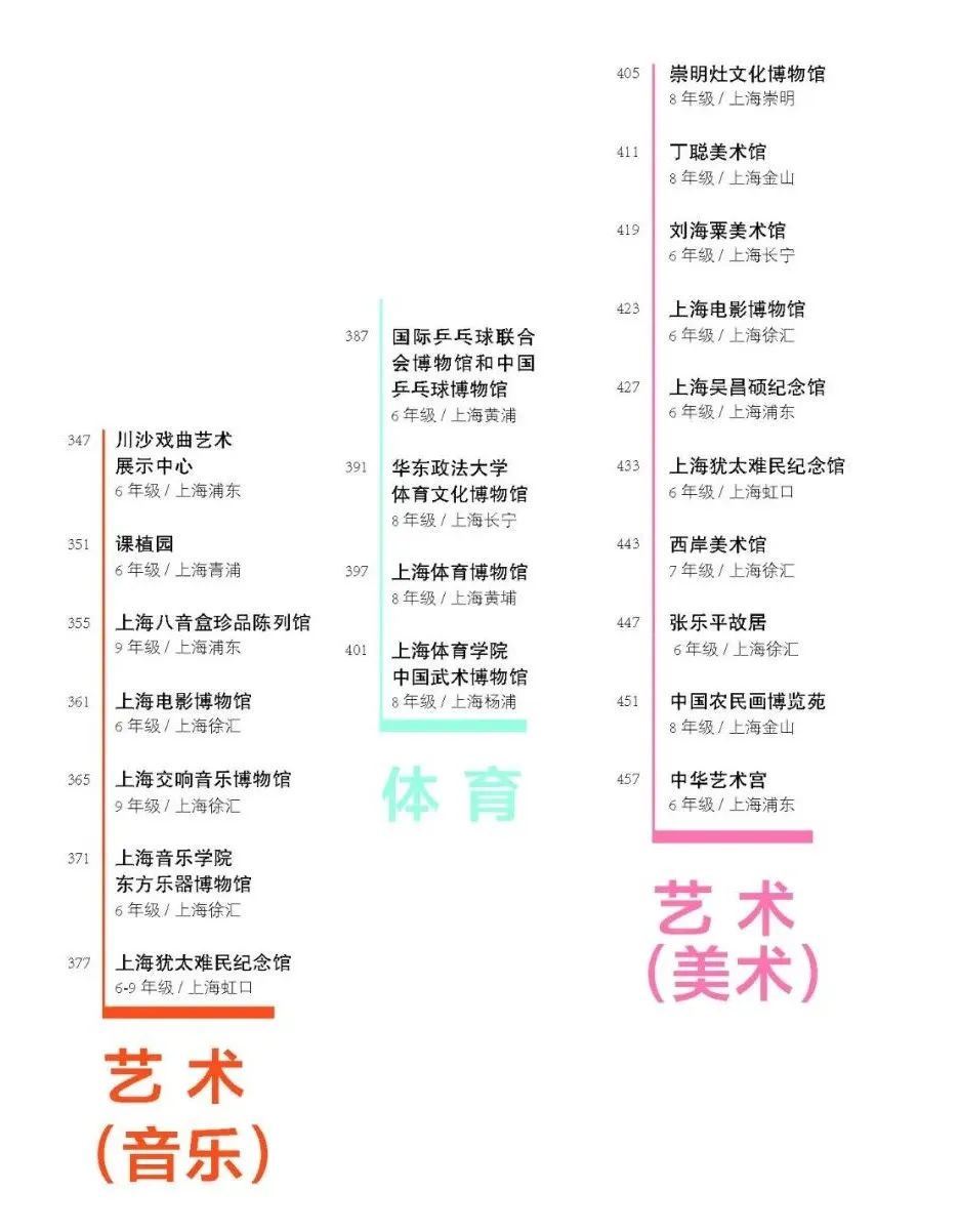 三是凸显“上海文化”品牌,如选取承载红色文化、海派文化、江南文化特征的上海电影博物馆、上海吴昌硕纪念馆、川沙戏曲艺术展示中心等;融合“建筑可阅读”的理念来认识博物馆,理解诸如上海市历史博物馆、上海气象博物馆等在延续城市文脉、保留城市记忆的作用;收录反映城市立体造像、被列入“上海历史文化风貌区”的上海邮政博物馆、上海犹太难民纪念馆、张乐平故居等;还有属于“一江一河”概念的西岸美术馆、苏州河工业文明展示馆等都分列其间,这些都是将文化软实力转化为青少年教育资源的初步尝试。