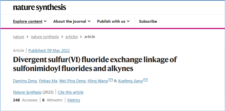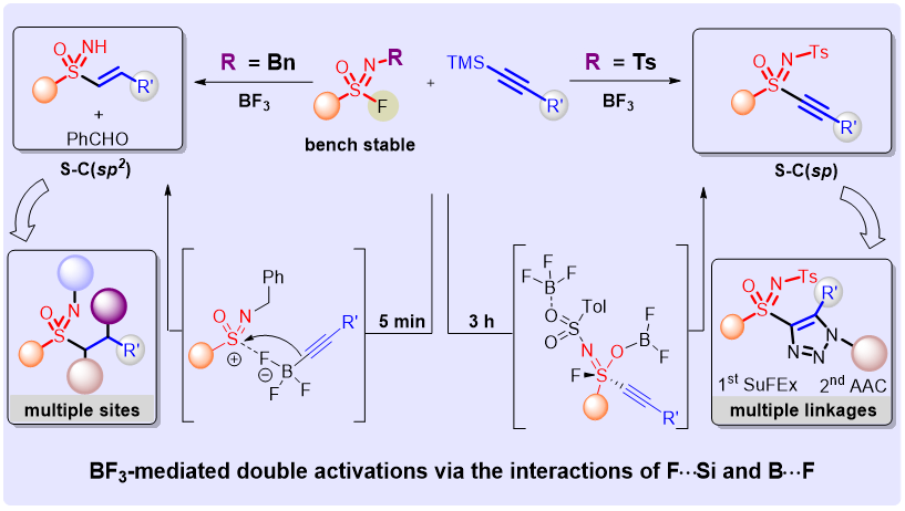 近日,华东师大化学与分子工程学院姜雪峰、王明团队在氟代砜亚胺的调控SuFEx(sulfur(VI)-fluoride exchange)链接方面取得进展。研究团队开发了氟代砜亚胺与TMS-炔的调控SuFEx链接化学,可快速链接高效构建S(VI)-C(sp2)键或S(VI)-C(sp)键。该链接运用硅-氟的强结合能 (BDE = 135 kcal/mol),通过三氟化硼作为氟转移试剂,协同实现S(VI)-F键的断裂和Si-C键的活化。研究成果以“多样性氟代砜亚胺与炔烃SuFEx链接(Divergent sulfur(VI) fluoride exchange linkage of sulfonimidoyl fluorides and alkynes)”为题,于2022年5月9日在《自然·合成》(Nature Synthesis)上发表。
