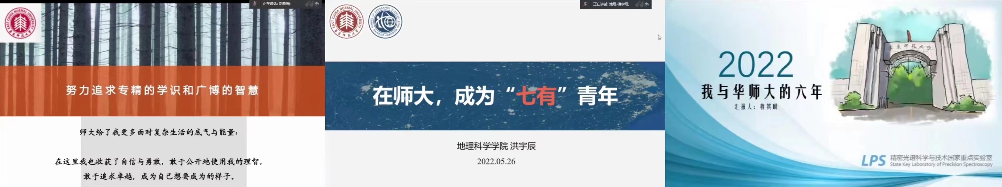 孟宪承书院、中国语言文学系的本科生刘晓梅毕业后将回到家乡成为一名光荣的教师,地理科学学院硕士生洪宇辰将作为选调生赴成都市委员会组织部工作,精密光谱科学与技术国家重点实验室博士生蒋其麟将继续留校从事博士后工作。三位同学分别作了主题发言,分享了在学校的成长和收获。刘晓梅说:“学校给予我更多面对复杂生活的底气与能量,让我收获了自信与勇敢。洪宇辰说:“师大的学习生活,使我成长为一名有思想、有理想、有信仰、有情怀、有目标、有担当、有力量的‘七有’青年”。蒋其麟说:“在师大攻读研究生的过程中,我明白了学习中最重要的是遇到问题不怕挫折,要勇于不断尝试不断思考。”