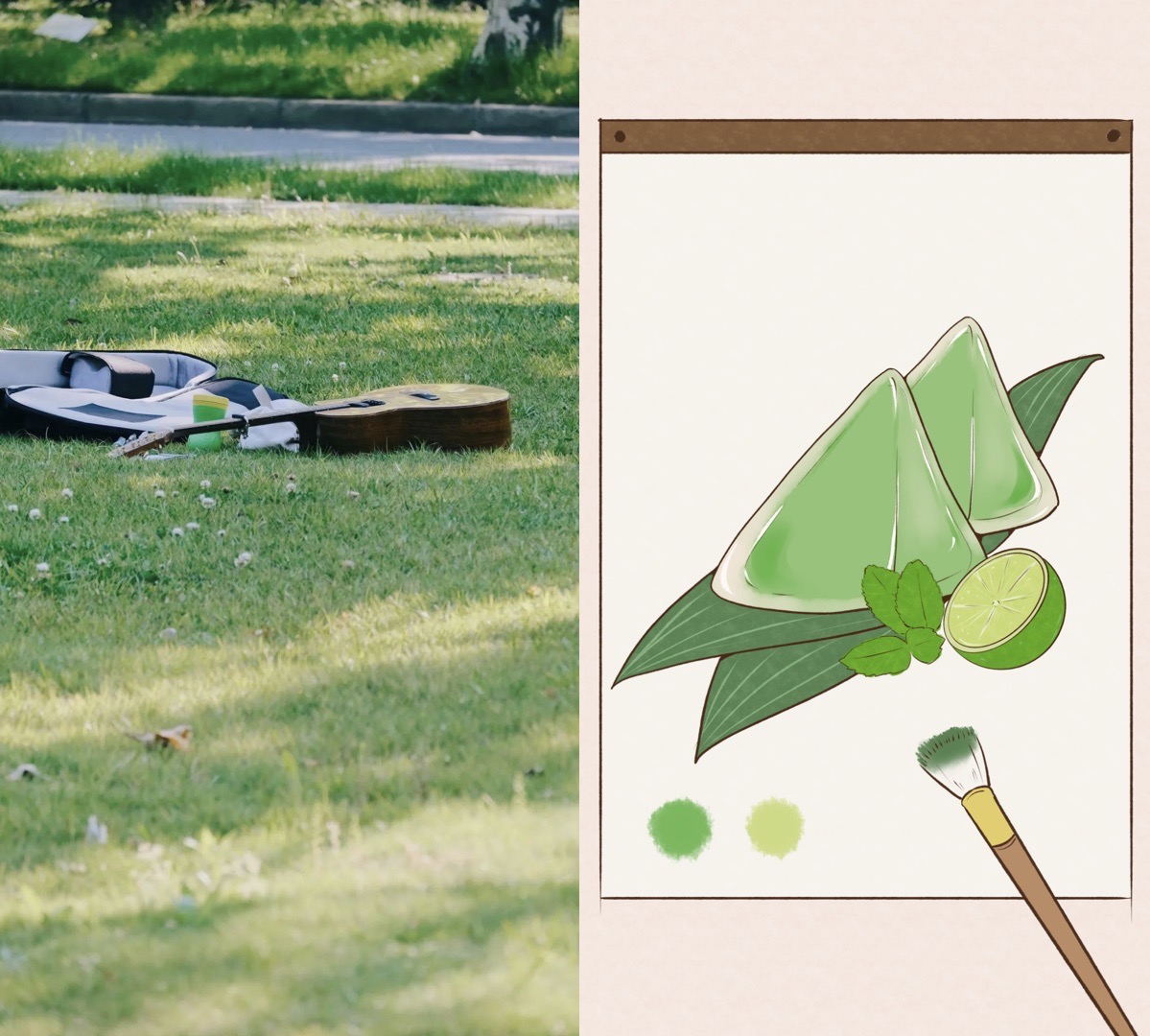 走累了,就坐在青青草地。树荫里有一缕青柠薄荷味道的凉意,还有三两少年的身影。你拿出粽子,熏染上这里的气息。
