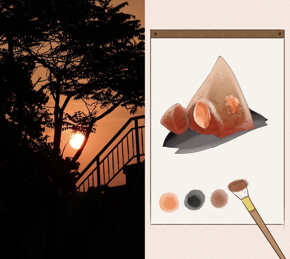 落日余晖,树影斑驳,你打开了这只蛋黄肉粽。粽香铺满夕阳,树根听你讲述,肆意挥洒的奋斗青春。
