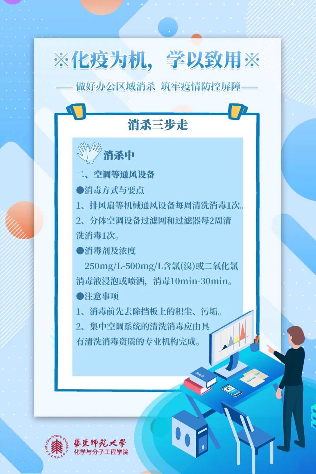 消杀五原则是什么?如何完成办公区域消杀?跟着化学与分子工程学院8张海报学起来!