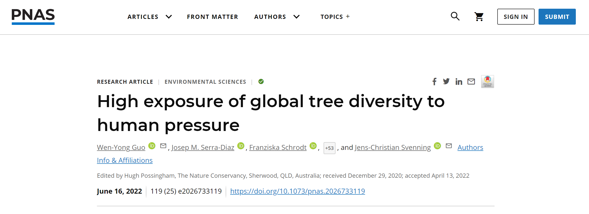 6月16日,美国科学院院刊PNAS在线刊登了万象城awcsport官网生态与环境科学学院和浙江天童森林生态系统国家野外科学观测研究站郭文永研究员团队及其合作者的成果High exposure of global tree diversity to human pressure,该研究利用目前最详尽的全球树种数据库,对46752个树种的保护现状进行了量化分析。