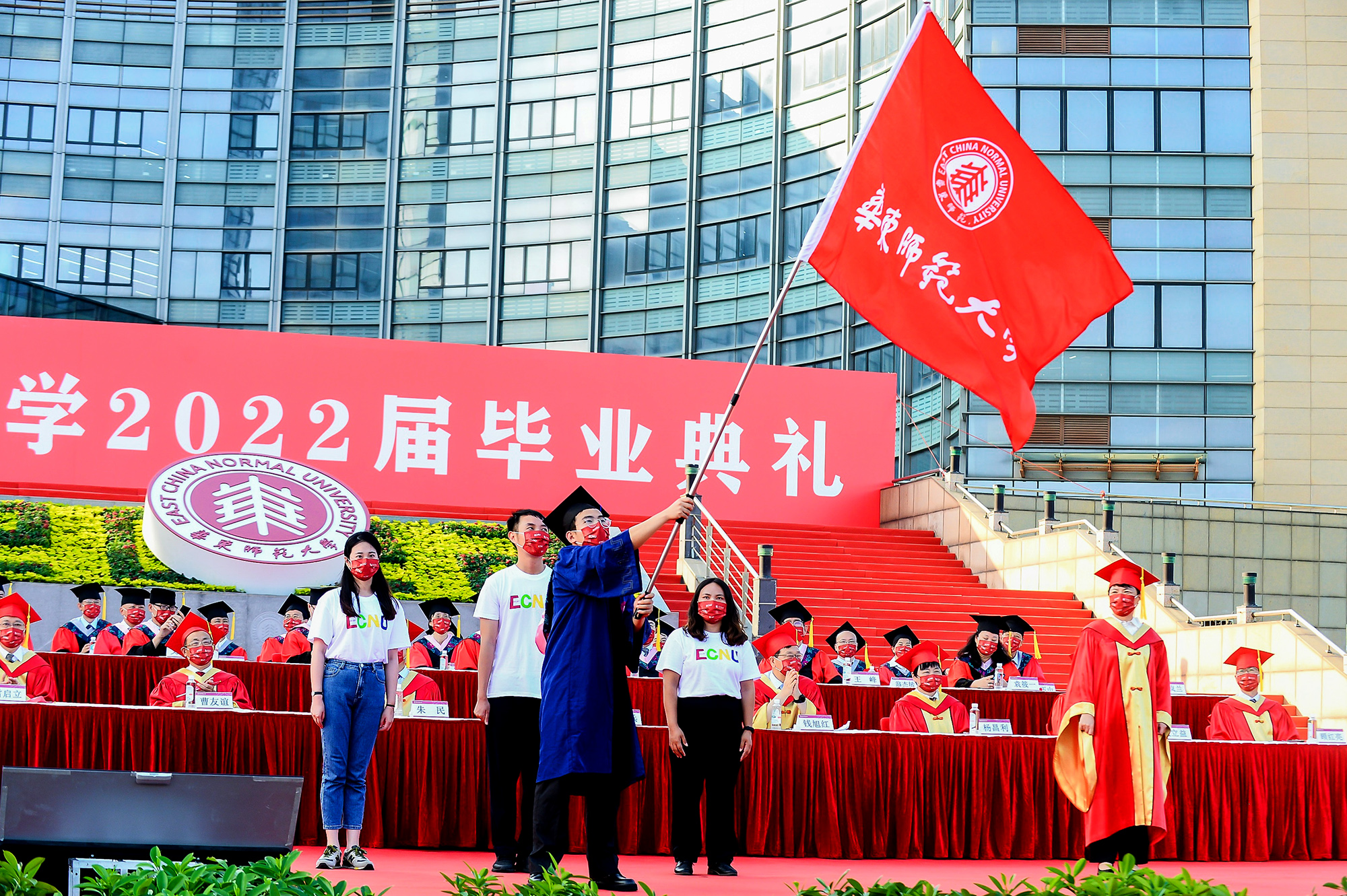 华东师大2022届毕业生线上线下欢聚一堂。毕业典礼由在校参加战疫的师生志愿者一起主持,一直坚守在防疫第一线、守护和陪伴毕业生共克时艰的宿管阿姨、食堂大厨、保安叔叔等后勤员工代表也到场欢送毕业生迈向新征程。