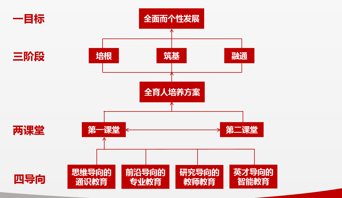 “培根、筑基、融通”三个站点对应“三段式”人才培养模式,贯穿始终的是“思维导向的通识教育、前沿导向的专业教育、研究导向的教师教育、英才导向的智能教育”为引领的卓越课程体系,还有多样性人才培养改革模式、“多元联动”育人体系,最终实现个人的全面而个性发展——实现卓越。