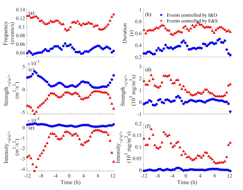 论文揭示了在不规则半日潮海区底边界层内湍流相干结构的潮周期性变化特征:随着一日内潮汐过程的发展,四个象限的时间占比(Time share)与雷诺应力贡献(<u’w’> contribution)发生了周期性的变化。研究还指出,湍流能量生成耗散的不平衡对湍流相干结构起到了重要的控制作用。落潮期间,更高的耗散率导致Inward与Outward事件的时间占比增加,进而引起对雷诺应力贡献的周期性变化。