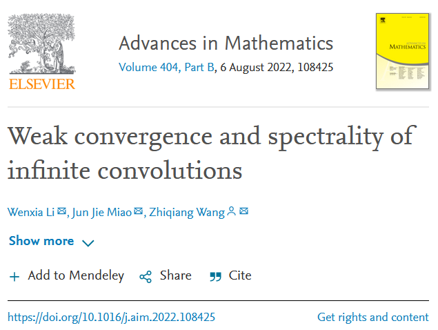 分形几何中研究的奇异测度也可以具有谱性,但因为与绝对连续测度有着非常大的区别,近年来被众多学者所关注。数学科学学院分形团队李文侠教授、苗俊杰副教授及博士研究生王志强专注于奇异测度谱性的研究,给出了无穷卷积弱收敛的充要条件,从而证实了他人提出的一个猜测。在此基础上,他们利用无穷卷积给出了一类支撑集非紧的奇异谱测度,这极大地拓展了奇异测度谱性的研究对象。更进一步,他们构造了丰富的支撑集非紧的奇异谱测度,并证明了这些支撑集的维数具有介值性性质。相关研究论文“Weak convergence and spectrality of infinite convolutions”被国际著名数学期刊Advances in Mathematics接收并于2022年5月2日在线发表,将刊登在2022年8月第404卷。