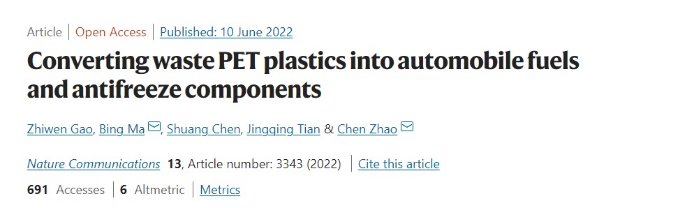 聚对苯二甲酸乙二醇酯(PET)是最丰富的聚酯塑料,广泛应用于纺织品与包装行业,为人类生活带来极大便利。但每年约有千万吨的废弃PET排入海洋,水体以及海洋生物的健康受到微塑料的严重威胁。为解决白色塑料污染问题,实现废旧塑料的回收与再利用,近日,万象城awcsport官网化学与分子工程学院教授赵晨及其团队在《自然-通讯》(Nature Communications)上于6月10日发表了以 " Converting waste PET plastics into automobile fuels and antifreeze components" 为题的研究论文,为海洋塑料问题的解决提供了可行的方案。