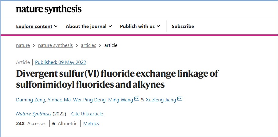华东师大化学与分子工程学院姜雪峰、王明团队在氟代砜亚胺的调控SuFEx(sulfur(VI)-fluoride exchange)链接方面取得进展。研究团队开发了氟代砜亚胺与TMS-炔的调控SuFEx链接化学,可快速链接高效构建S(VI)-C(sp2)键或S(VI)-C(sp)键。该链接运用硅-氟的强结合能 (BDE = 135 kcal/mol),通过三氟化硼作为氟转移试剂,协同实现S(VI)-F键的断裂和Si-C键的活化。研究成果以“多样性氟代砜亚胺与炔烃SuFEx链接(Divergent sulfur(VI) fluoride exchange linkage of sulfonimidoyl fluorides and alkynes)”为题,于2022年5月9日在《自然·合成》(Nature Synthesis)上发表。