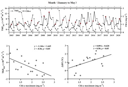 浮游植物春季水华 (遥感叶绿素a浓度)与湍动能产生速率 (TKERT)关系的年际特征分析