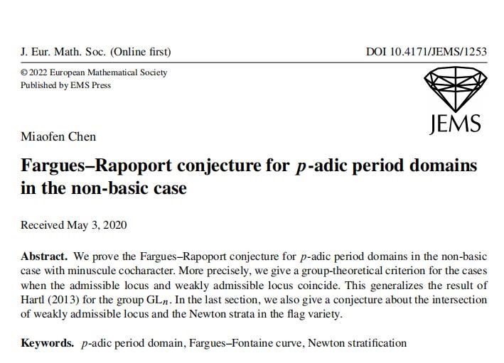 RZ空间由Rapoport(ICM 45分钟报告人)和Zink于上世纪九十年代引入,后被用于局部朗兰兹对应的实现。p进周期空间是从RZ空间的一般纤维到旗簇的p进周期映射的像,而弱可允许子集则是p进周期空间的一个代数逼近。根据Colmez(ICM 45分钟报告人)和Fontaine(法国科学院院士、ICM 45分钟报告人)的结果,弱可允许子集与p进周期空间具有相同的经典点。Fargues和Rapoport提出了一个猜想,给出了在基本情形下弱可允许子集与p进周期空间相等的一个等价条件。2021年在一项发表于国际新兴重要数学杂志Camb.J.Math的工作中,数学科学学院陈苗芬副教授与Fargues及申旭合作证明了 Fargues-Rapoport猜想。